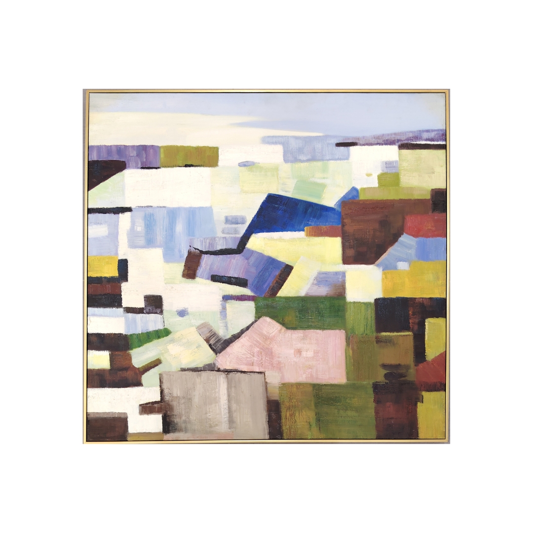 This abstract oil painting features soft earth tones blended with hints of blue, green, and pink — framed beautifully in gold for a touch of elegance. The composition feels calm yet full of motion, as if capturing light and landscapes in abstract form.