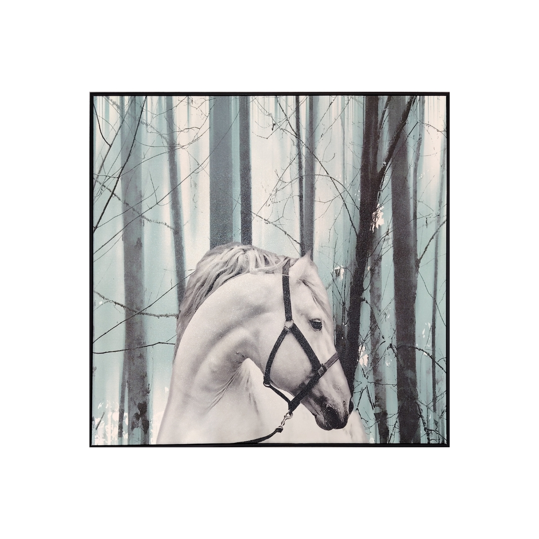 Printed on textured canvas, every detail feels lifelike, from the softness of the horse’s coat to the quiet depth of the trees behind it.