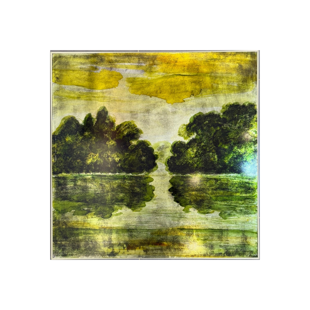 Bring nature indoors with Green Reflection, a premium metal wall art piece featuring a calm waterscape and lush green reflections. The brushed metal surface creates a subtle shine, catching light beautifully from different angles.