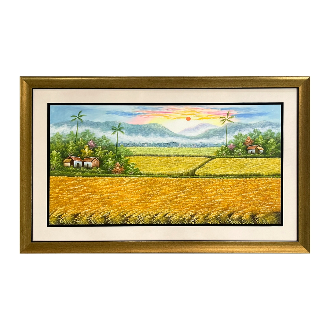 这幅田园风景油画以广阔的金黄稻田为主体,搭配远山、村屋与晨曦天空,营造出宁静而富足的乡村景象。画面层次分明,色彩温暖自然,传递出稳定、踏实与丰收的美好寓意。